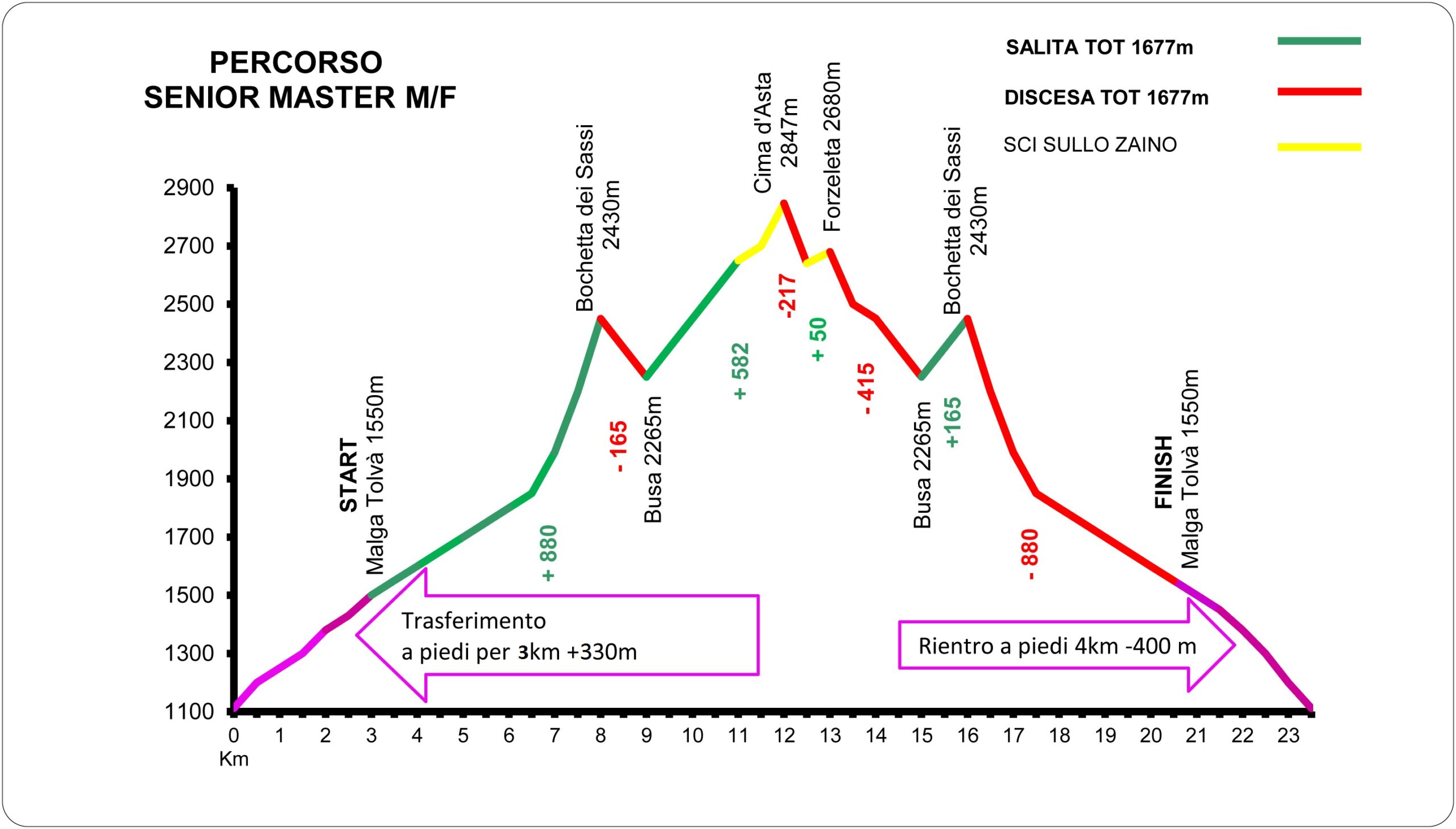 Il percorso SENIOR E MASTER prevede un trasferimento autonomo con partenza nei pressi del campeggio Val Malene all’imbocco della Val Tolvà fino a malga Tolvà di 3 km +330m dove alle ORE 8.30 sarà dato lo START.